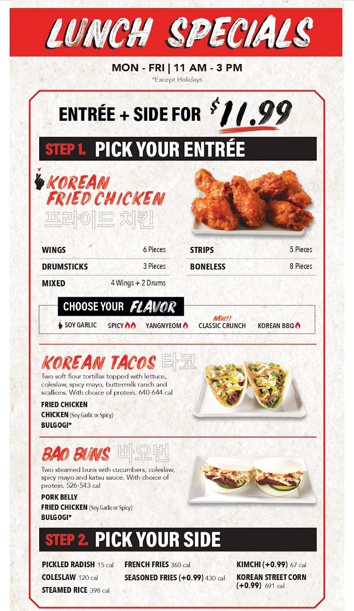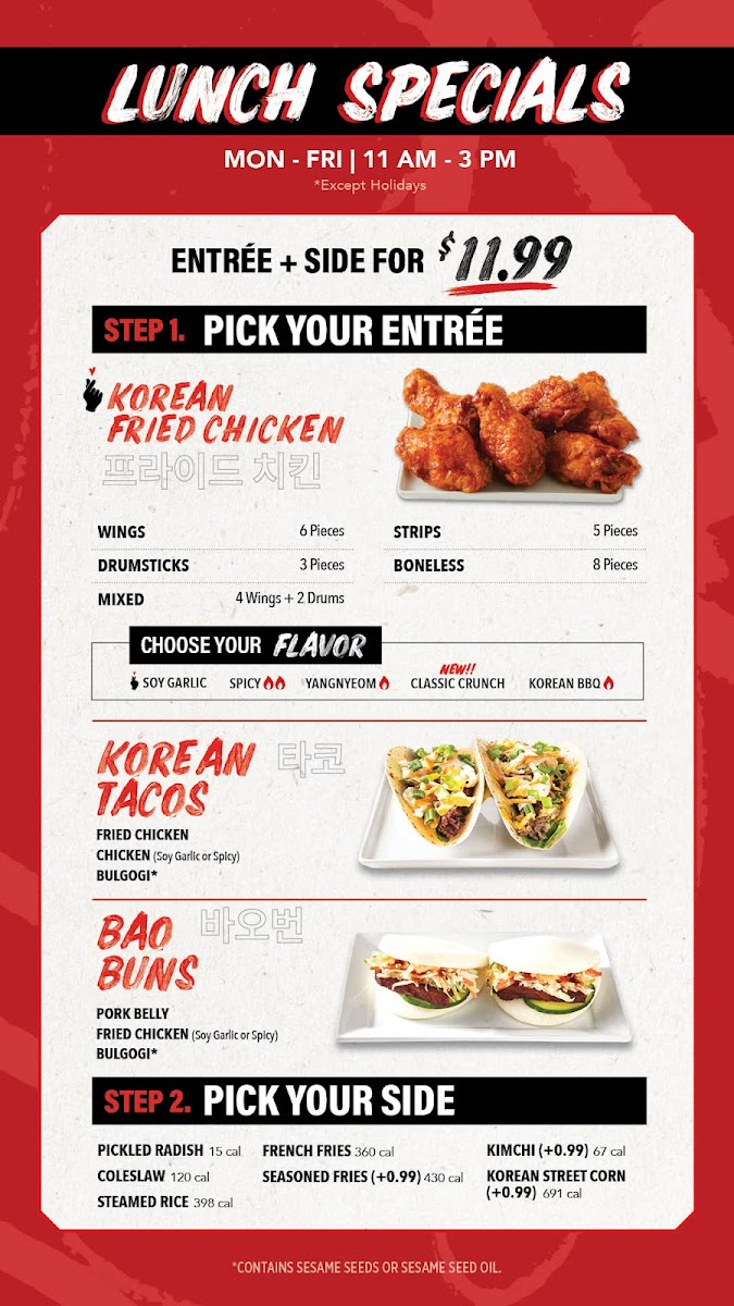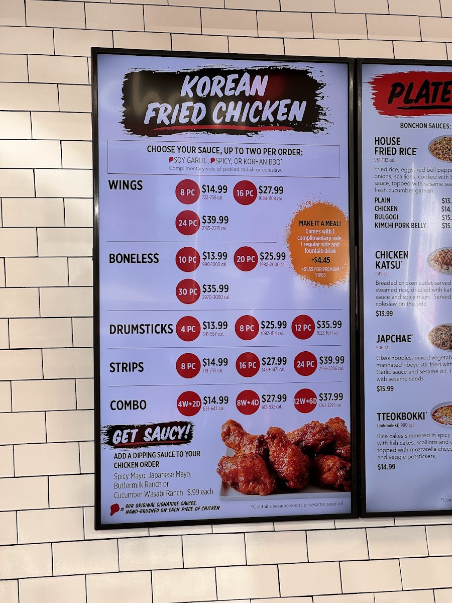 Hand-brushed with your choice of a Bonchon Signature Sauce and a side.