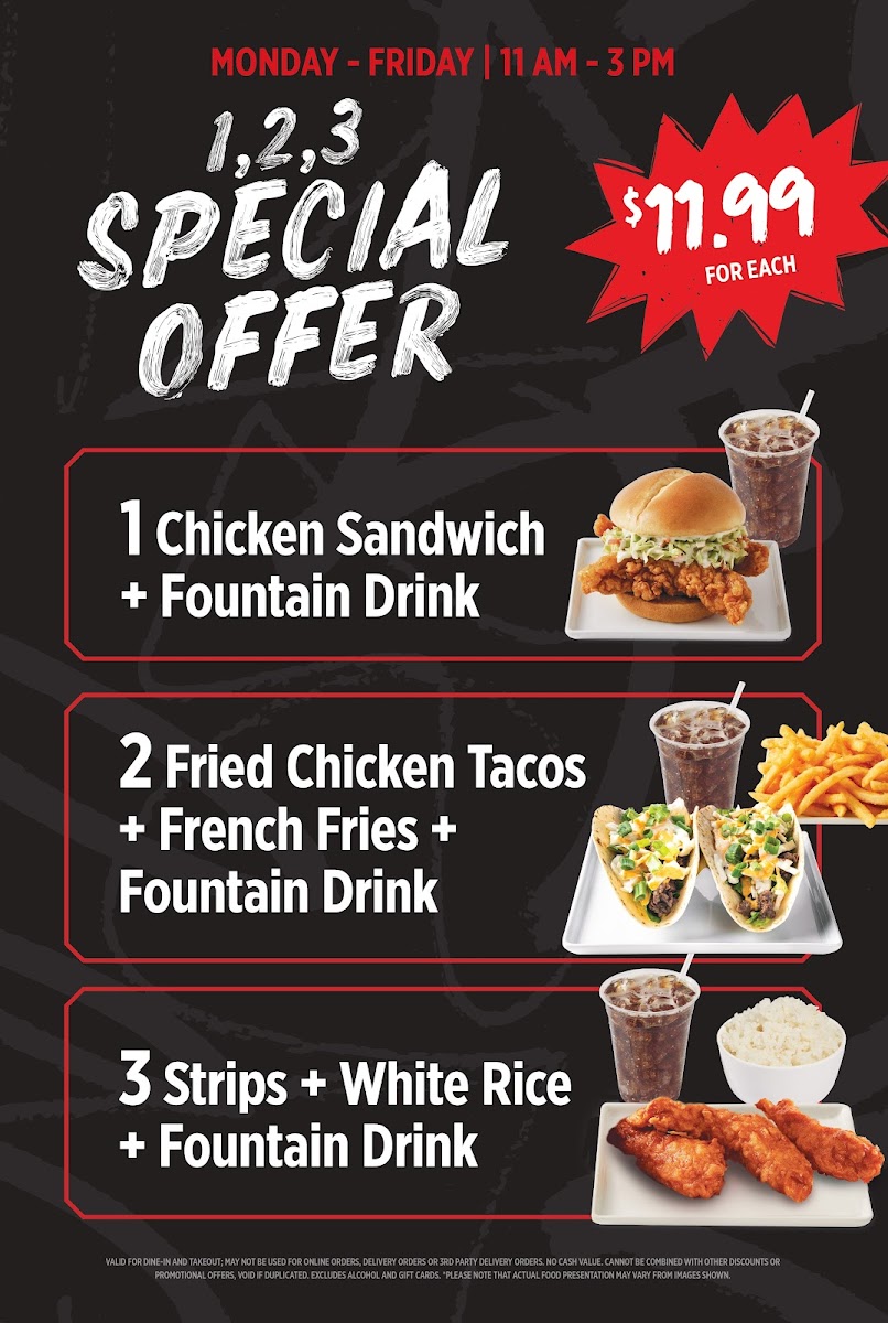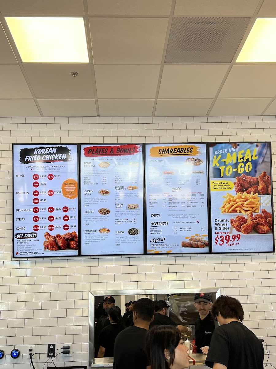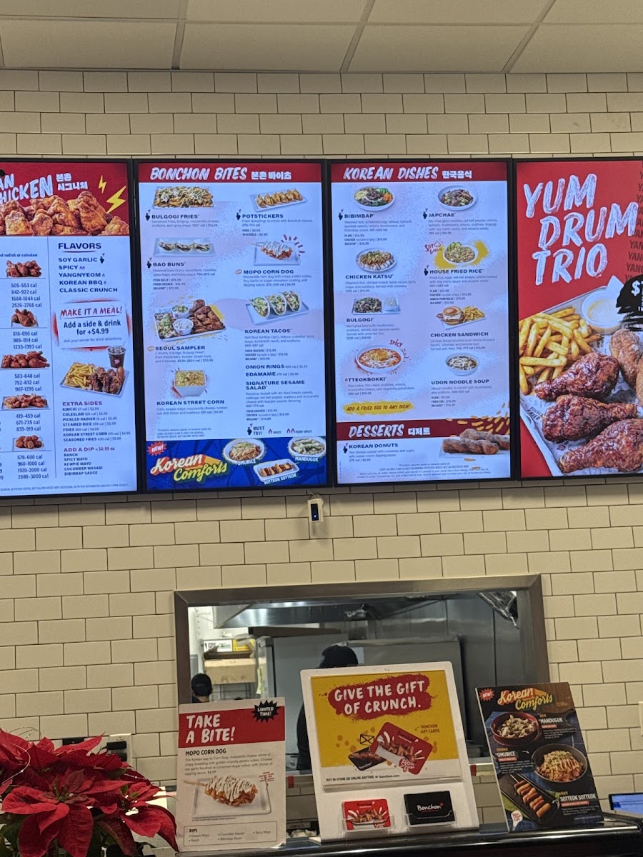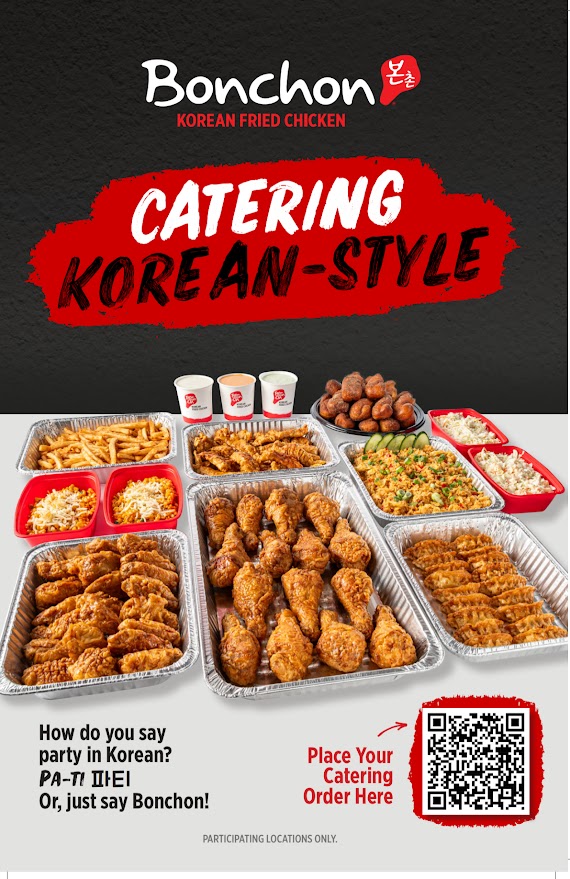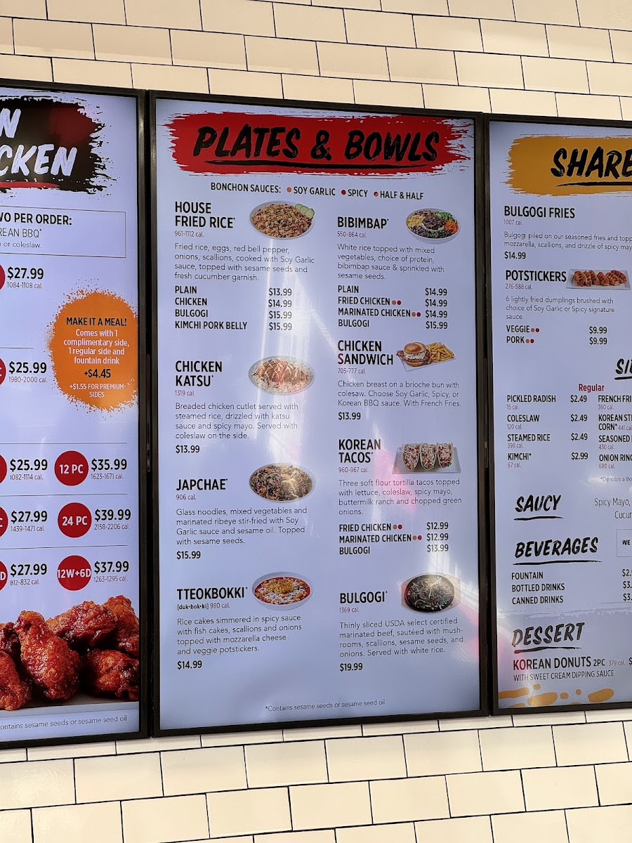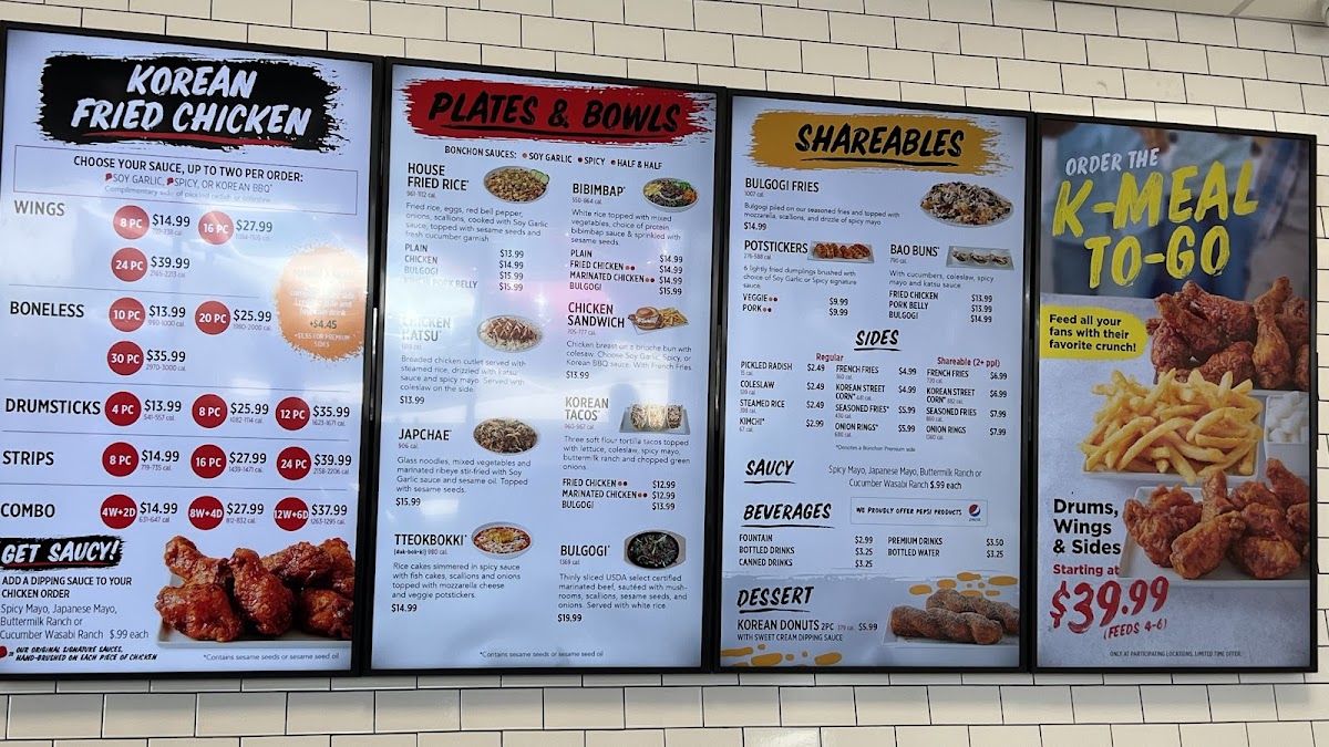 At Bonchon Stevenson Ranch - Pico Canyon Rd, the menu offers a vibrant mix of Korean flavors that cater to both casual diners and fans of classic fried chicken. For those looking for a quick bite, the Dine In Daily Specials feature the irresistible $1 Wings Special, while the Lunch Specials provide options like Wings 6 PC, Boneless 8 PC, Drums 3 PC, Strips 5 PC, and the Mixed 6 PC with 4 Wings + 2 Drums, all designed to satisfy varying appetites. The Korean Fried Chicken section highlights Drumsticks, Strips, Wings Mixed, and Boneless pieces, showcasing Bonchon’s signature crispy, savory coating. Fans of shareable snacks will enjoy the Bonchon Bites, including Sotteok Sotteok, MoPo Corndog, Bulgogi Fries, Bao Buns, and the Seoul Sampler. For heartier meals, the Korean Dishes lineup features comforting selections such as Dumpling Soup, Omurice, House Fried Rice, Bibimbap, and Japchae. Complementary Sides like Steamed Rice, Kimchi, Coleslaw, Pickled Radish, and Korean Street Corn round out the experience, while Sweets tempt with 1pc Korean Donut & Sauce or 2pc Korean Donuts & Sauce. For larger gatherings or takeout, Bonchon offers K-Meals To-Go for groups of 4-6, 6-8, or 8-10, as well as Party Bundles featuring Wings, Strips, Fried Rice, Fries, and Korean Street Corn. A selection of beverages, including Pepsi Bottle, Diet Pepsi Bottle, Mountain Dew Bottle, Starry Bottle, and Bottled Water, completes the menu, ensuring that every meal can be perfectly paired with a drink. Overall, the menu balances approachable comfort foods with unique Korean twists, making it ideal for both solo diners and groups seeking variety and flavor.